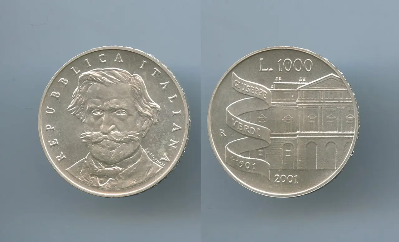 La moneta raffigurante il volto di Giuseppe Verdi con un’espressione fiera ed autorevole, consiste in una vecchia moneta da 1000 lire con uno scopo commemorativo. Infatti, questa moneta venne coniata in corrispondenza al centenario della morte del noto compositore e politico italiano. Si tratta di una moneta particolarmente ambita dai collezionisti di numismatica.